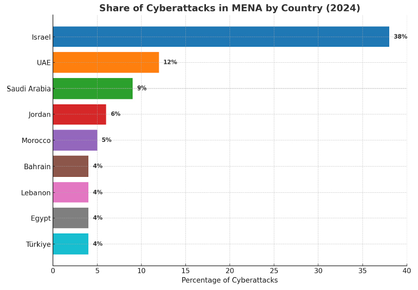 - By 2024, the UAE became the second most targeted country in MENA, facing 12% of all cyberattacks in the region, just behind Israel.