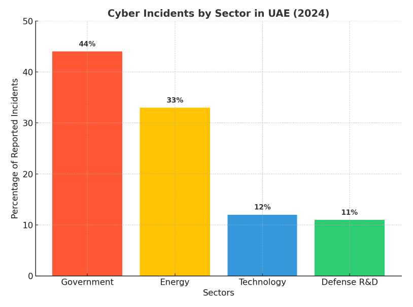 - In 2024, the government sector was the most targeted, accounting for 44% of all reported cyber incidents in the UAE, which shows how public institutions remain a top focus for attackers.