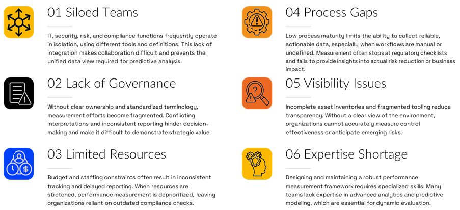 Traditional security measurement approaches often rely on static indicators such as compliance checklists, periodic audits, and qualitative assessments. While these methods satisfy regulatory requirements, they do not provide real-time visibility or predictive insights — creating blind spots that hinder proactive decision-making.